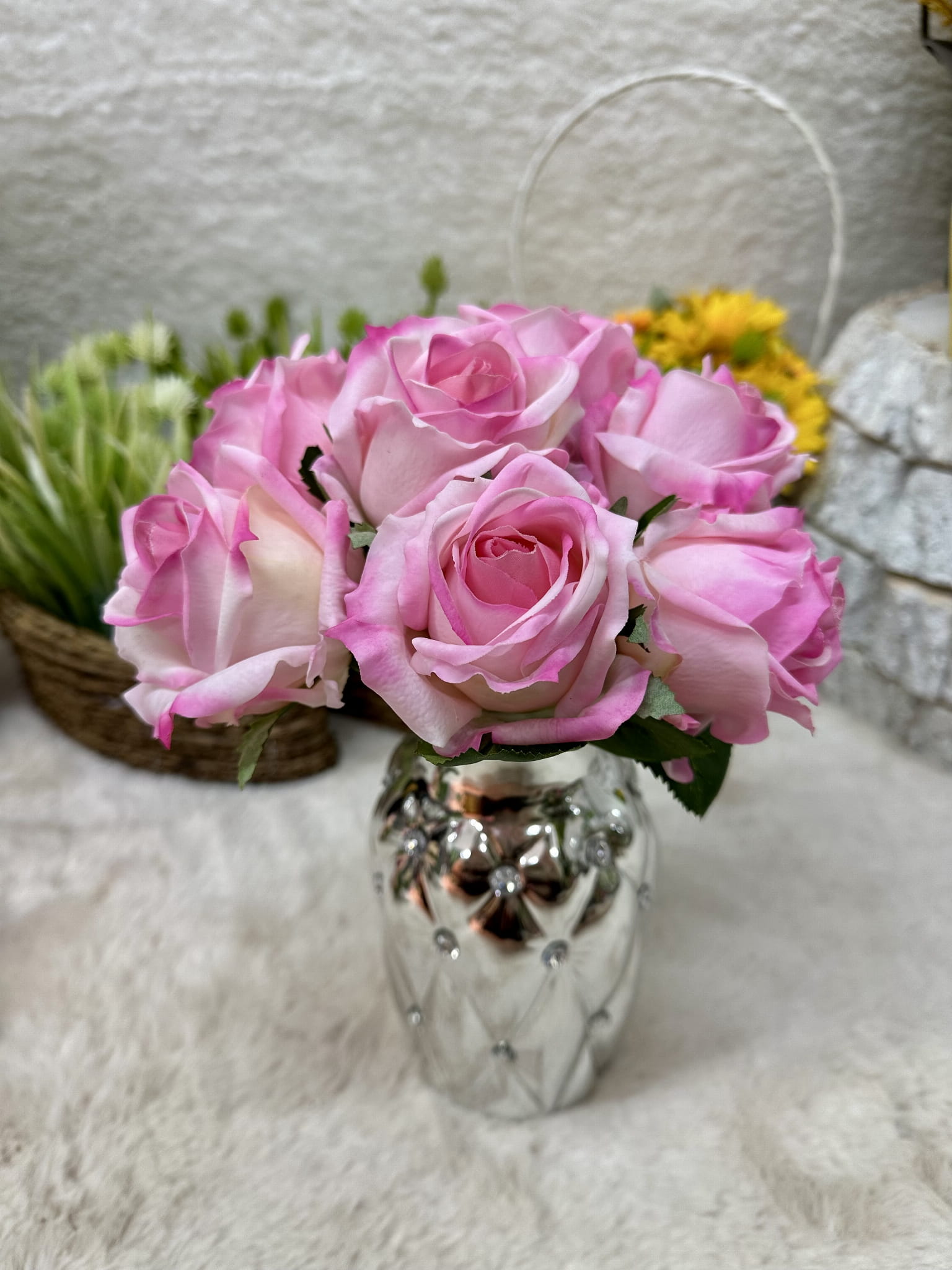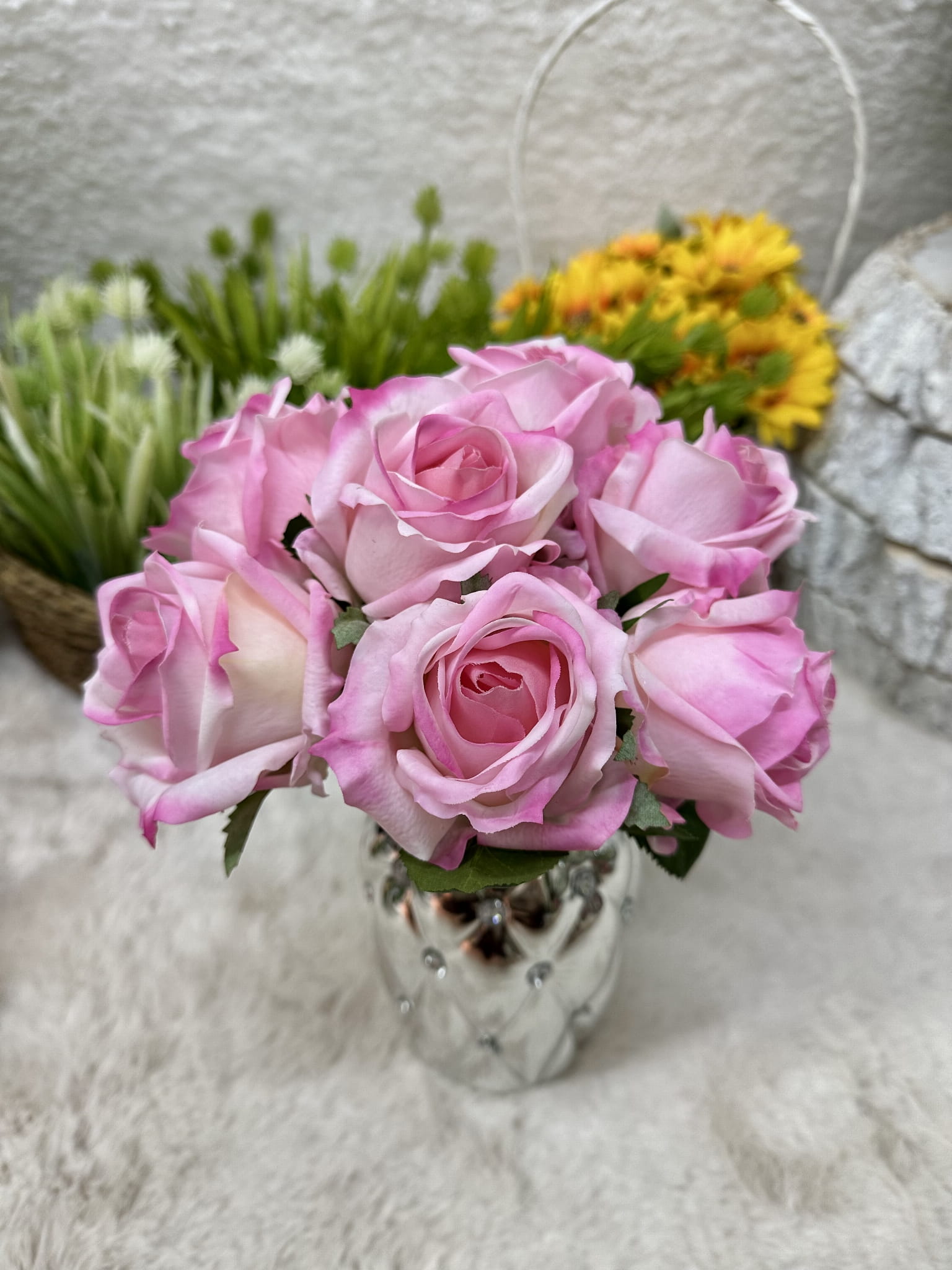 Sztuczna róża, która do złudzenia przypomina żywą. Nawet po latach będzie wyglądała tak samo świeżo i pięknie. Kwiat można zginać i dowolnie dopasować. Bukiet z różąpięknie ozdobi każdy zakątek Twojego domu, umieść je w ulubionym wazonie i ciesz się ich pięknym urokiem.
