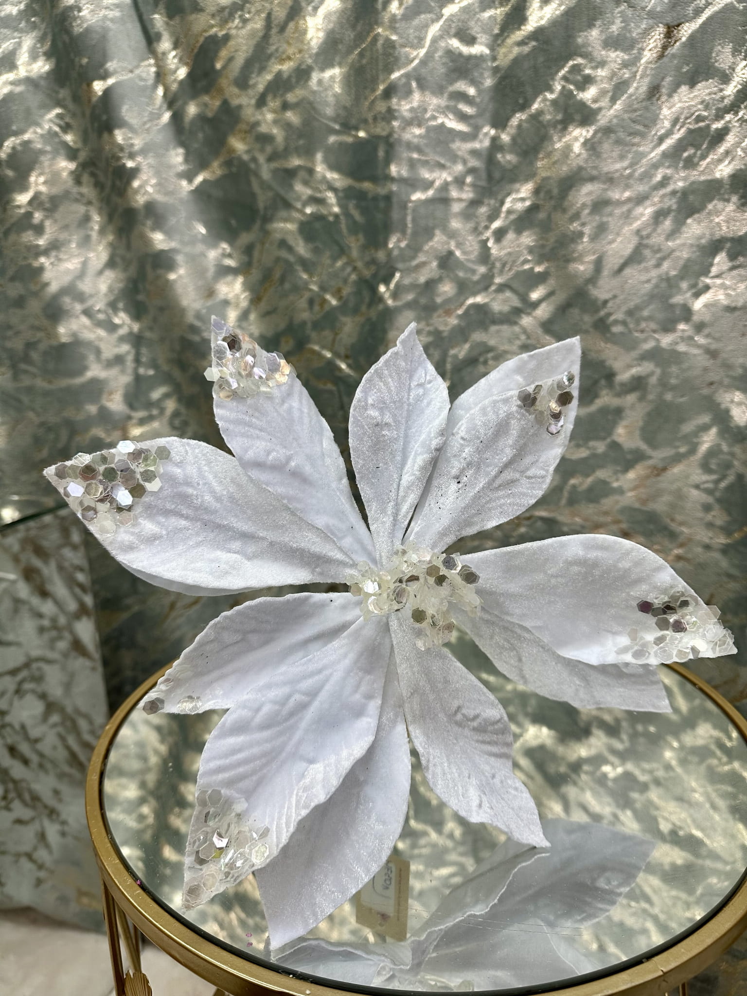 Gwiazda biała posypana brokatem. Idealna do wazonu, pięknie lśniąca wkomponuje się w świąteczny czas. Rewelacyjnie sprawdzi się jako ozdoba choinki. Nie może jej zabraknąć w domu, każdy będzie zachwycony.