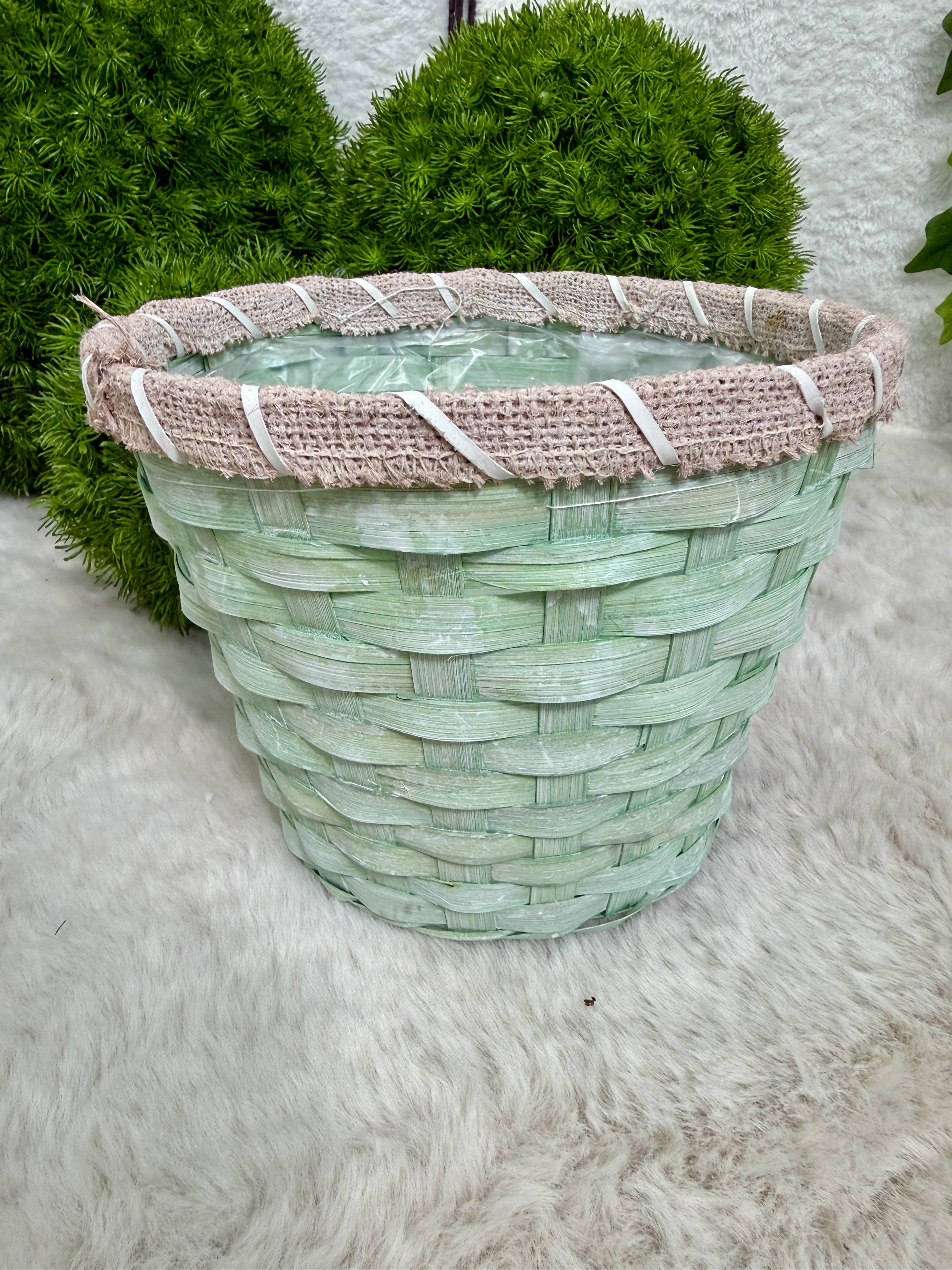 - Materiał: plecionka naturalna (wiklina / drewno) + tkanina jutowa + wkład foliowy