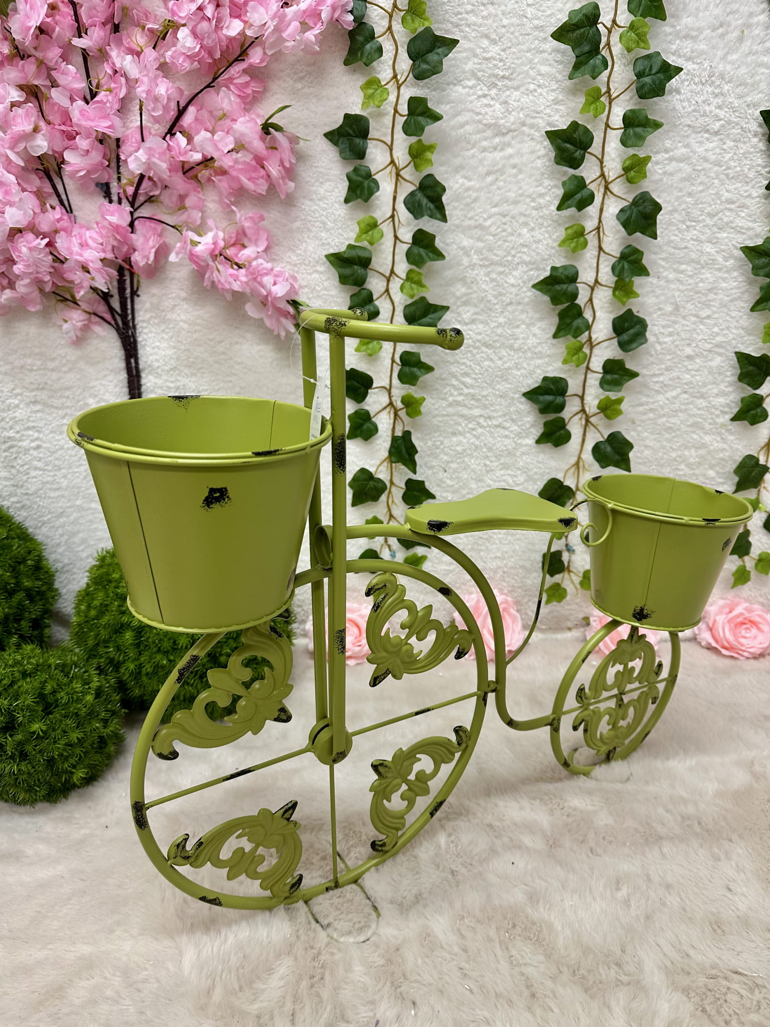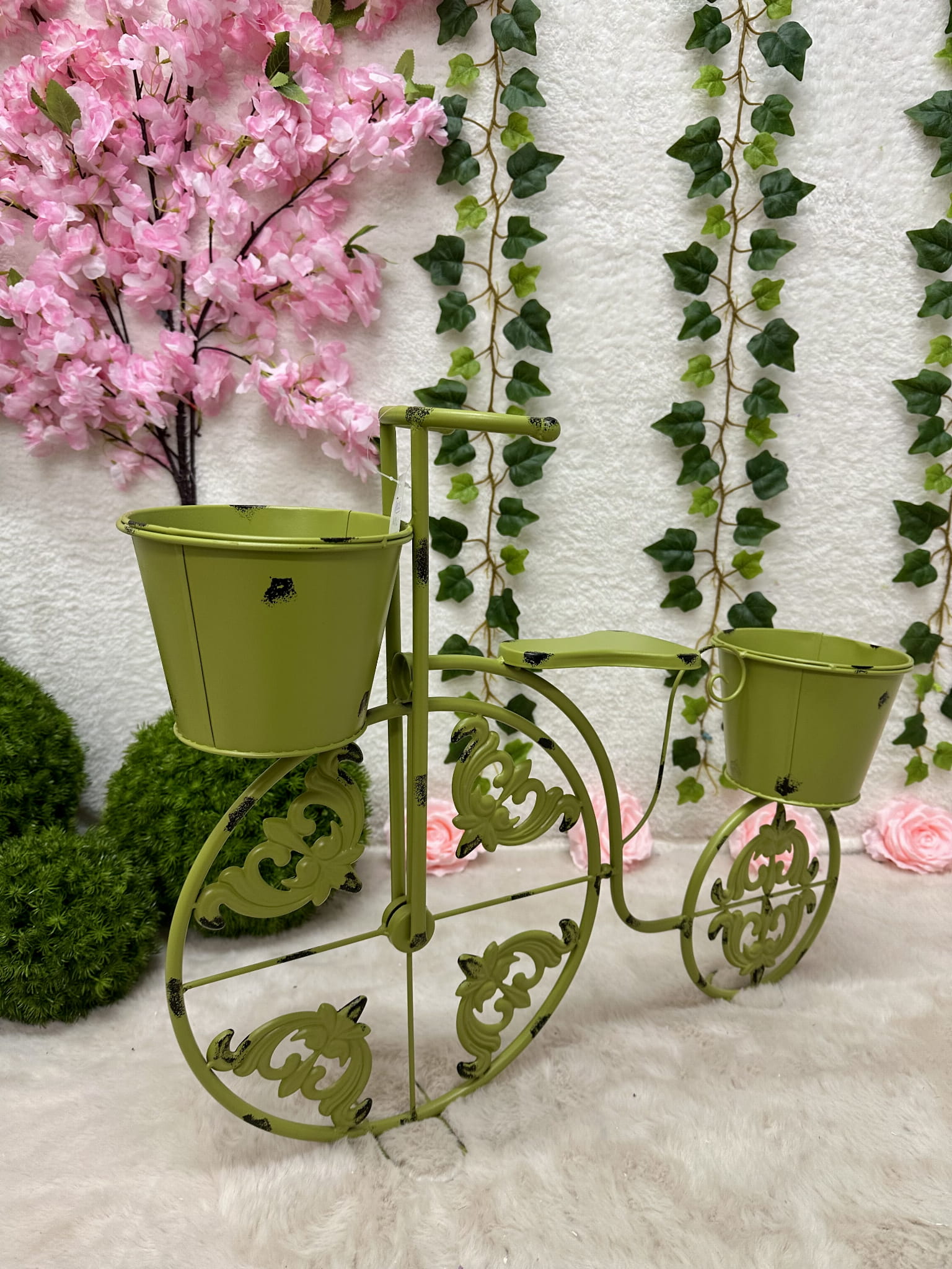 Rower metalowy zielony z miejscem na donice 50