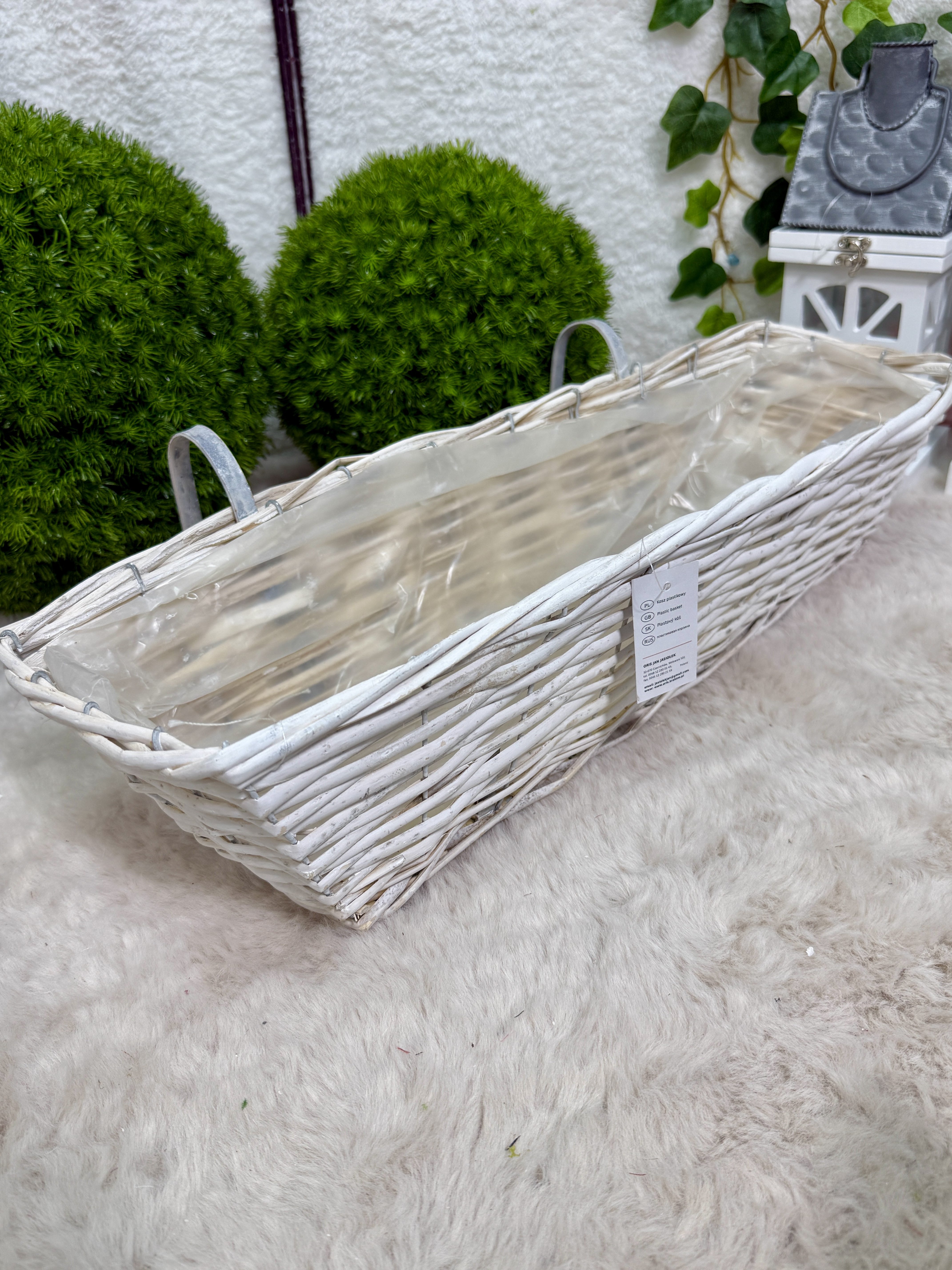 - Konstrukcja: pleciona skrzynka z metalowymi uchwytami do zawieszenia