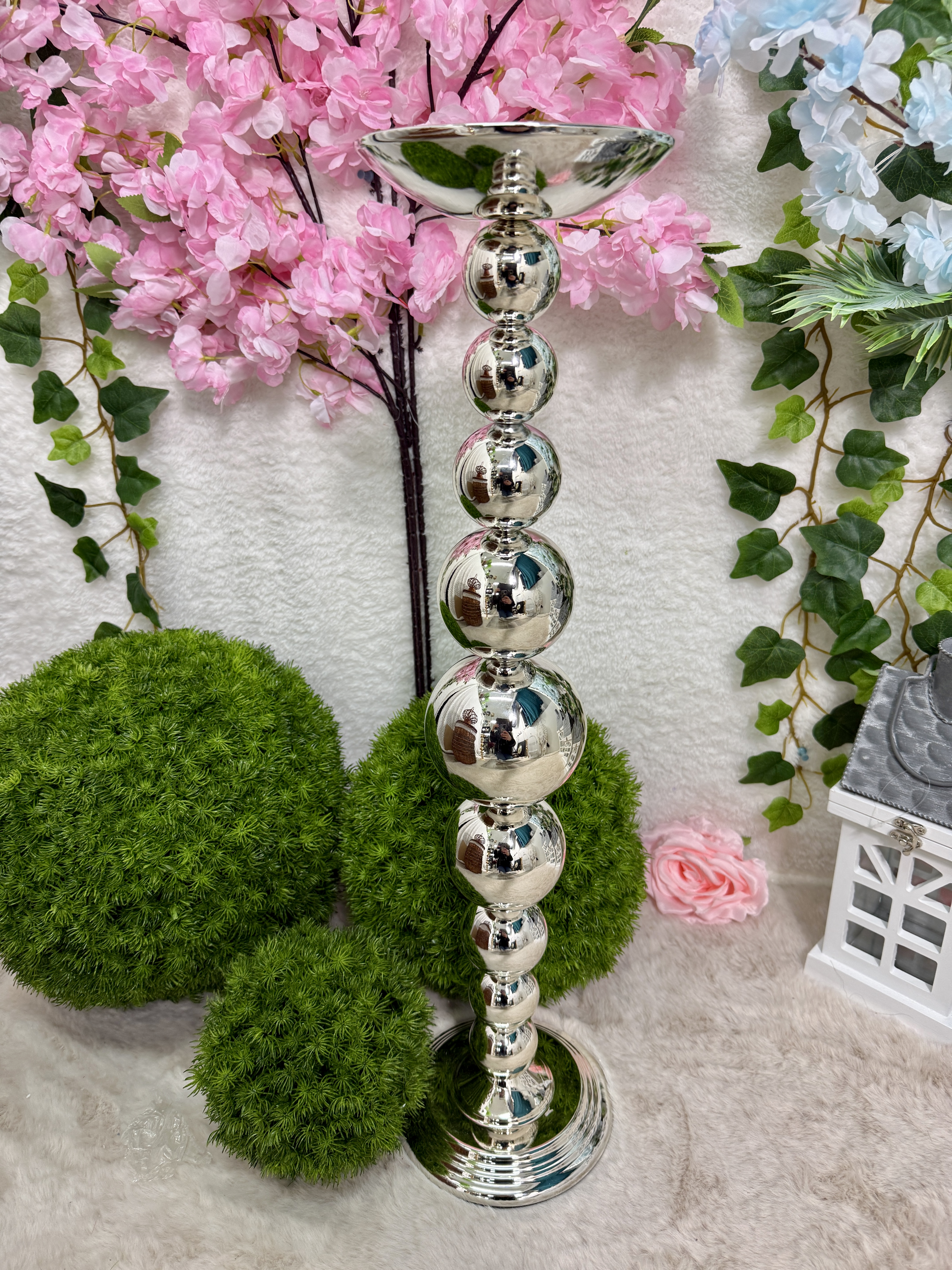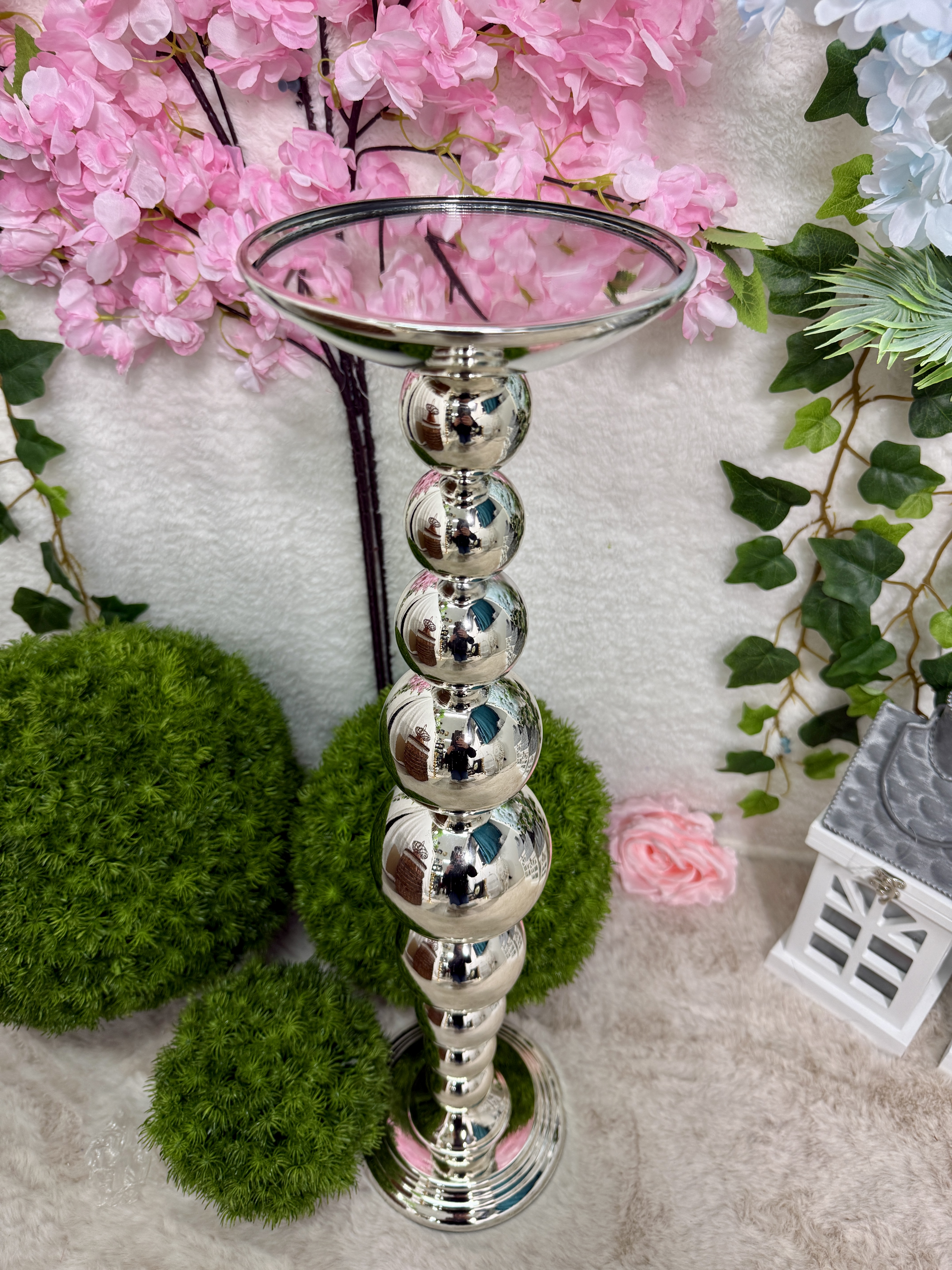 elegancki, srebrny stojak świecznik wykonany z metalu, utrzymany w stylu glamour.