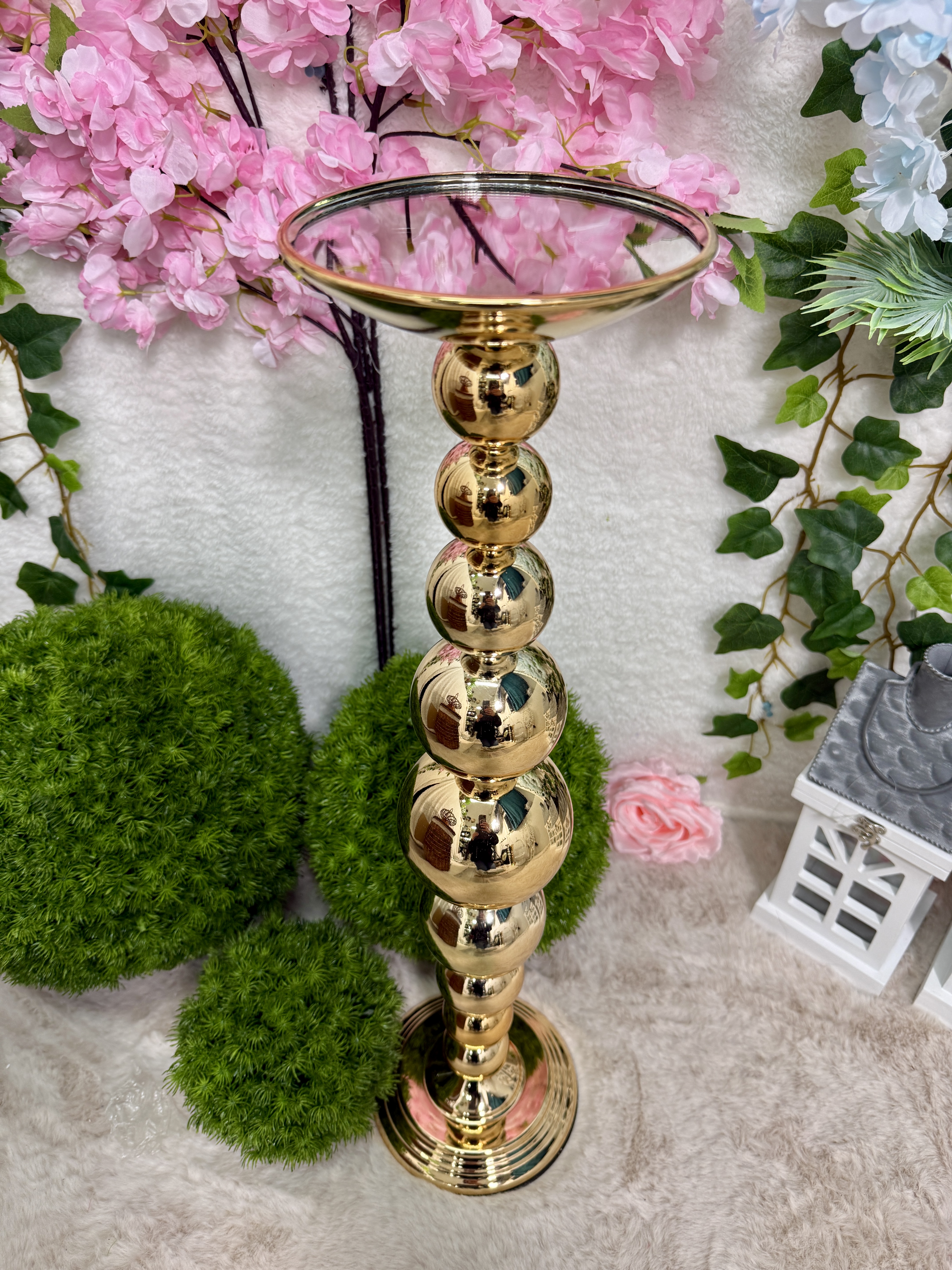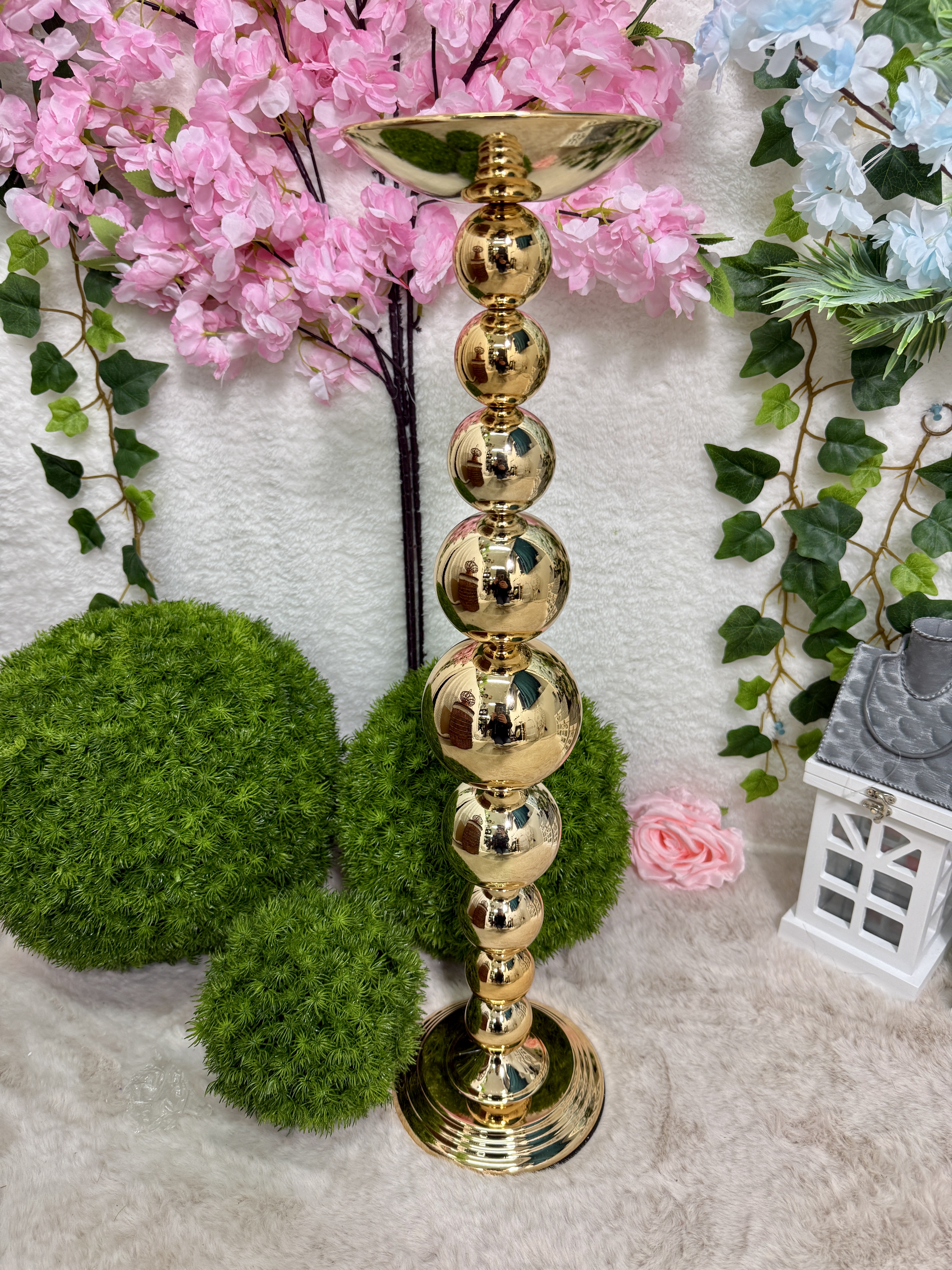 Świecznik charakteryzuje się wysoką, smukłą formą oraz efektowną konstrukcją złożoną z kulistych elementów ułożonych jeden nad drugim. Lustrzana, złota powierzchnia pięknie odbija światło, nadając całości luksusowego i dekoracyjnego wyglądu.