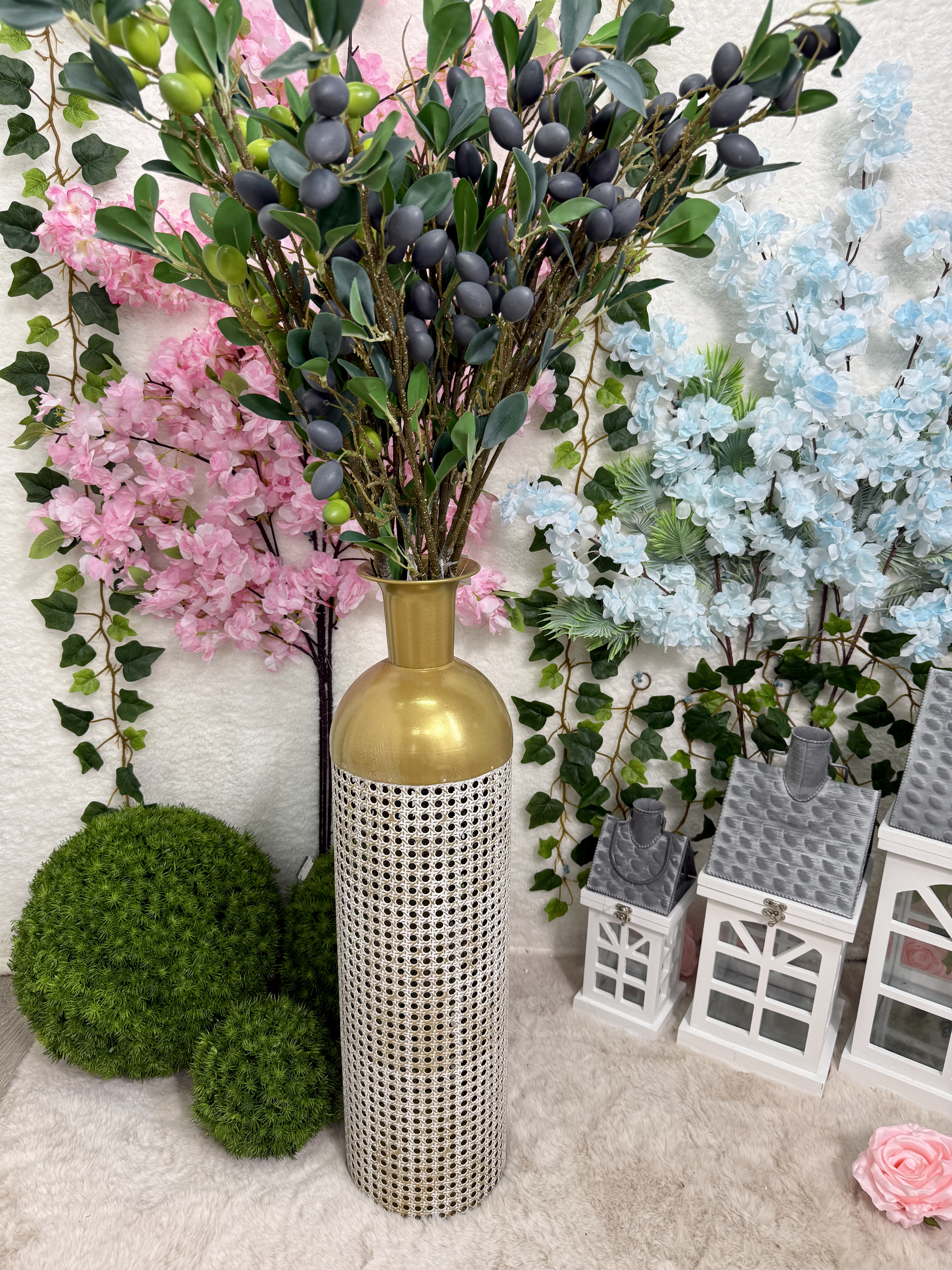 To stylowy, wysoki wazon, który stanowi wyrazisty element dekoracyjny i przyciąga uwagę w każdym wnętrzu.