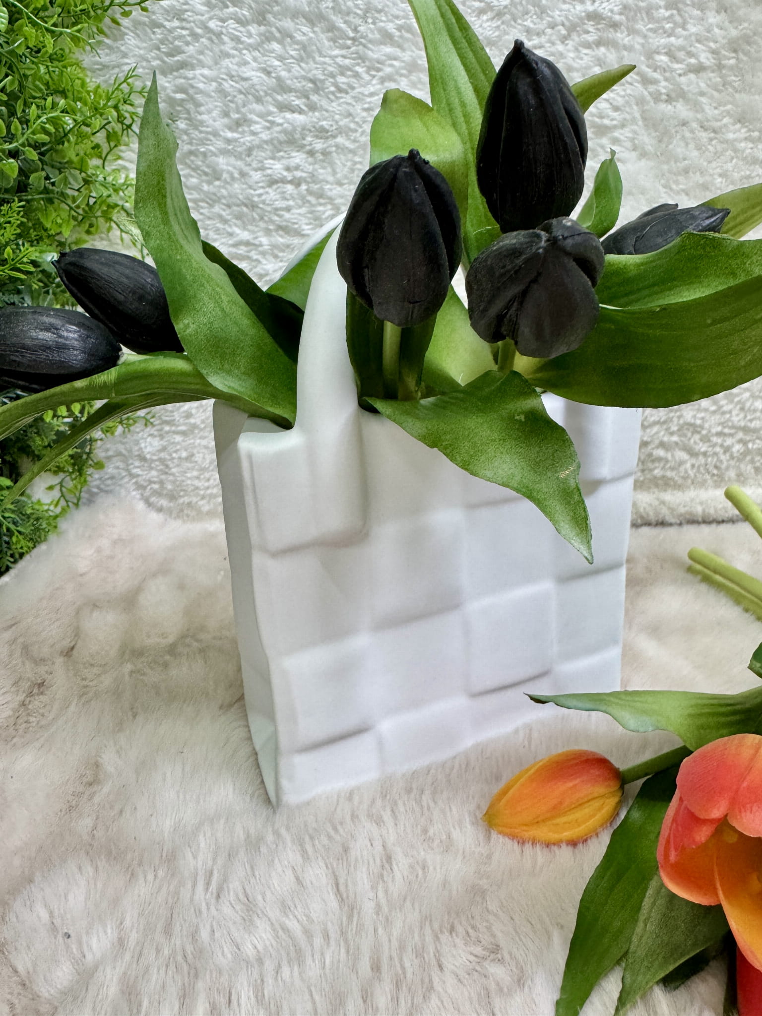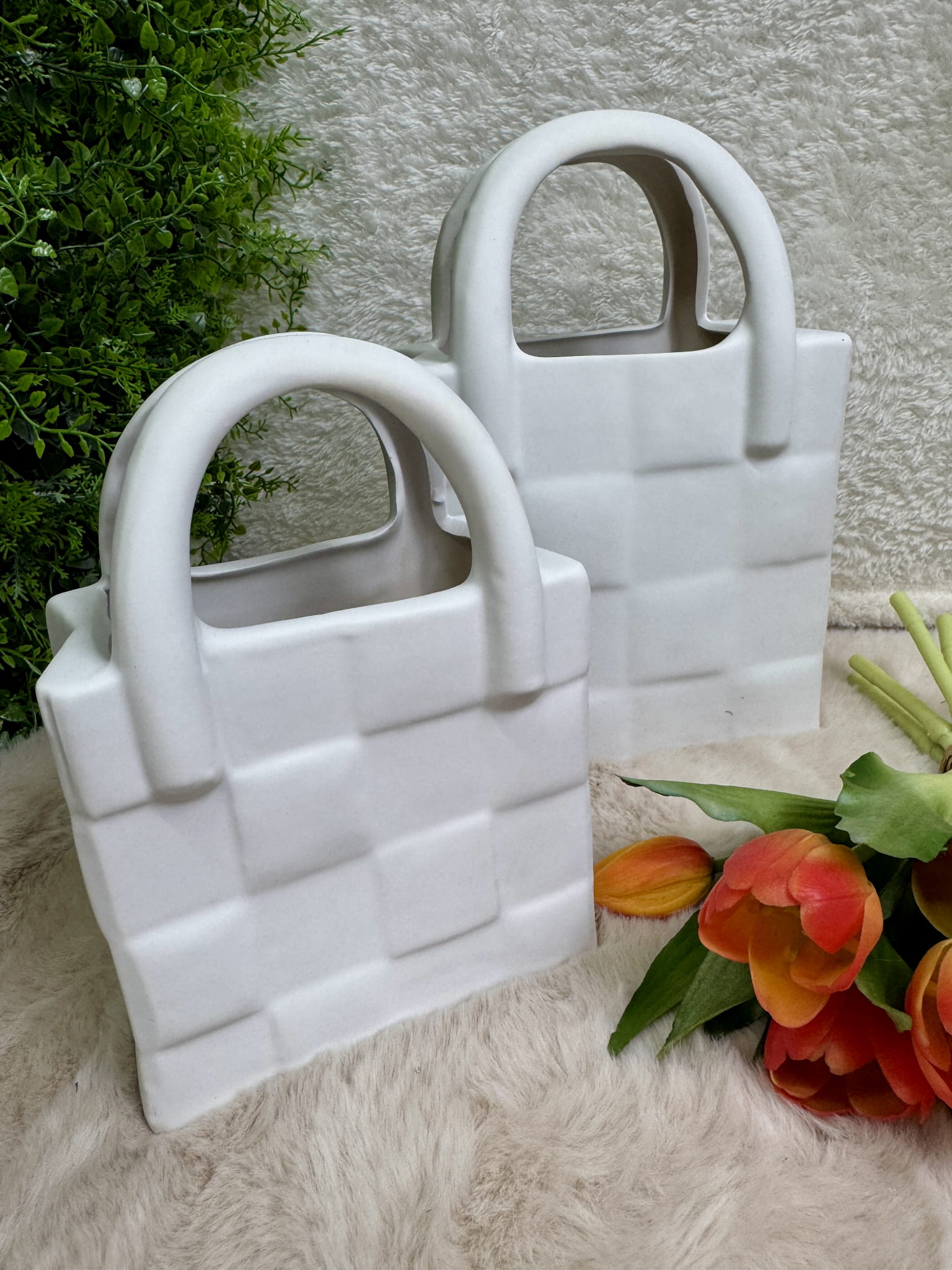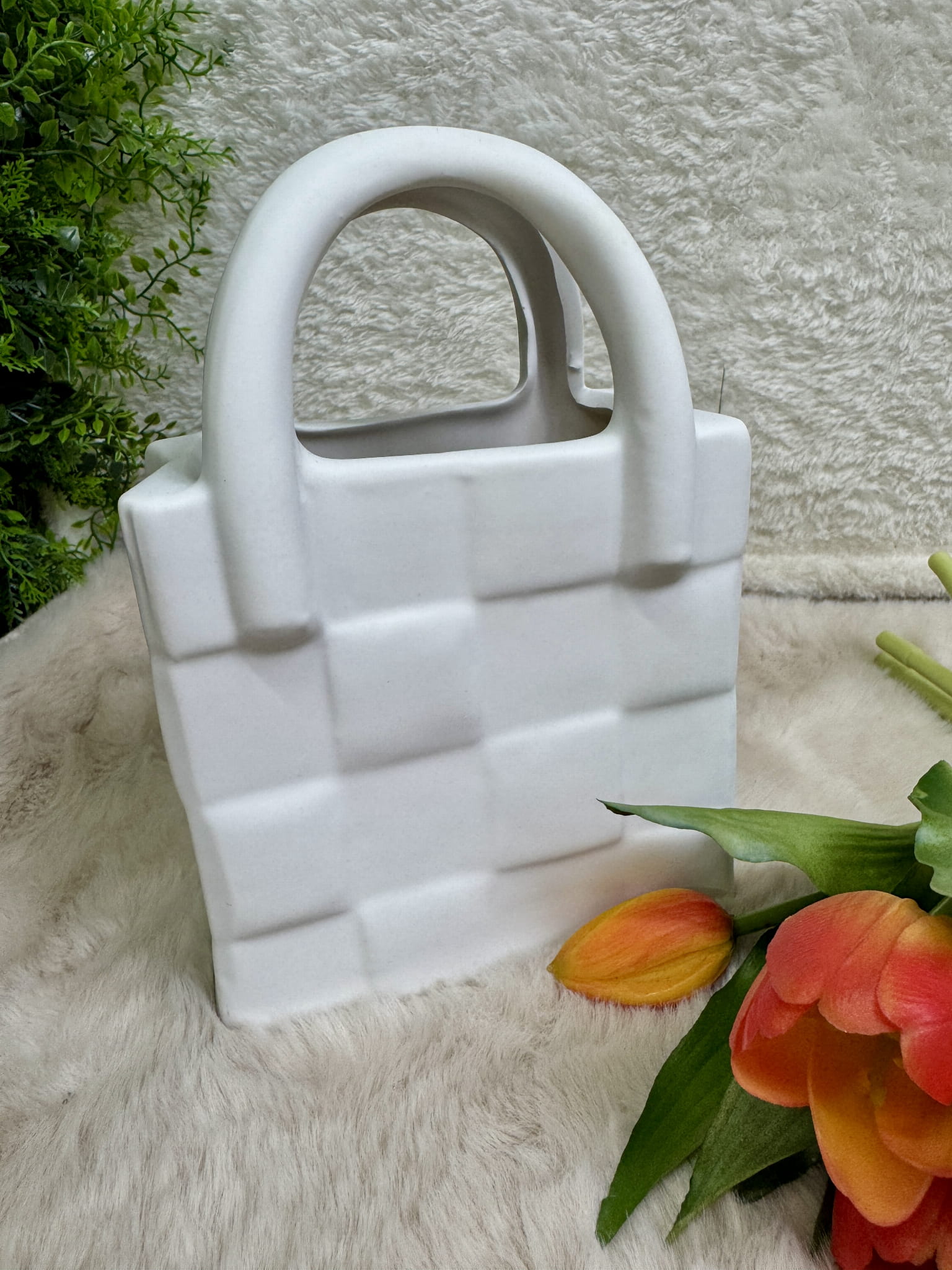 Ceramiczny wazon w kształcie torebki czaruje urokiem oraz niezwykle prezentuje się w każdym wnętrzu. Postaw go na komodzie, stole i ciesz się lustrzanym blaskiem. Świetnie prezentuje się zarówno w nowoczesnych, jak i klasycznych wystrojach. Idealne miejsce dla każdego rodzaju kwiatów. W połączeniu z tulipanami prezentuje się świetnie.