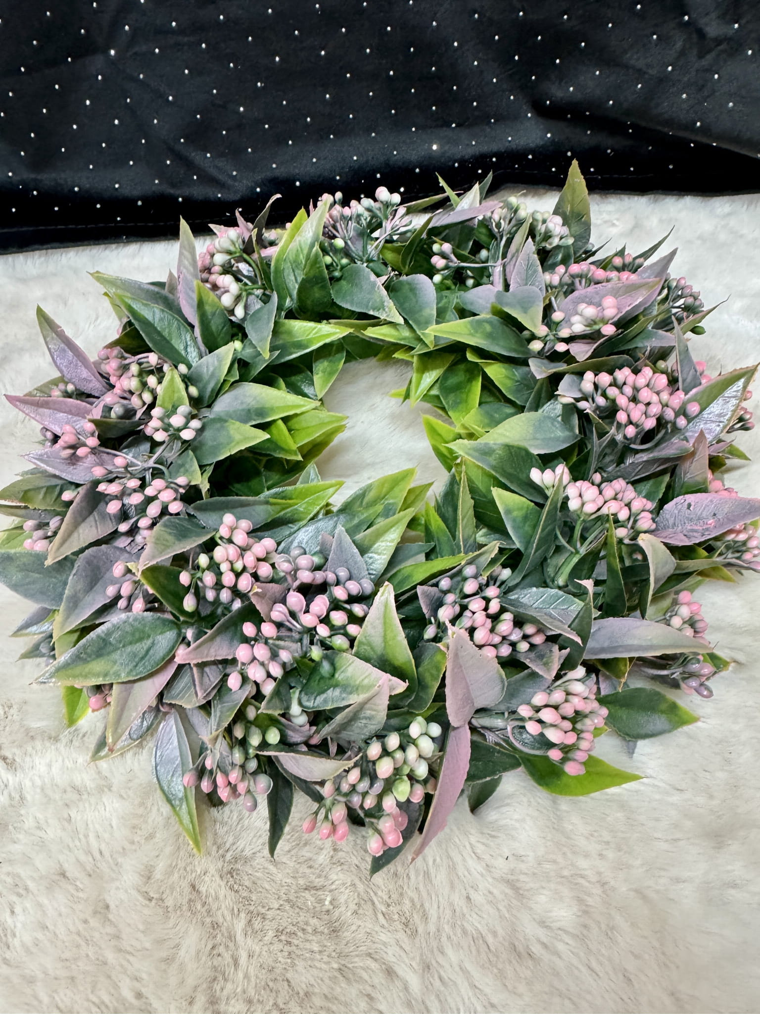 Niezwykle efektowna dekoracja, która ozdobi zarówno wnętrze Twojego domu jak i taras, balkon. Zaskocz wszystkich pięknym wystrojem. Wianek ozdobiony jest zielonymi listkami paprotki, co daje niezwykle naturalny efekt.