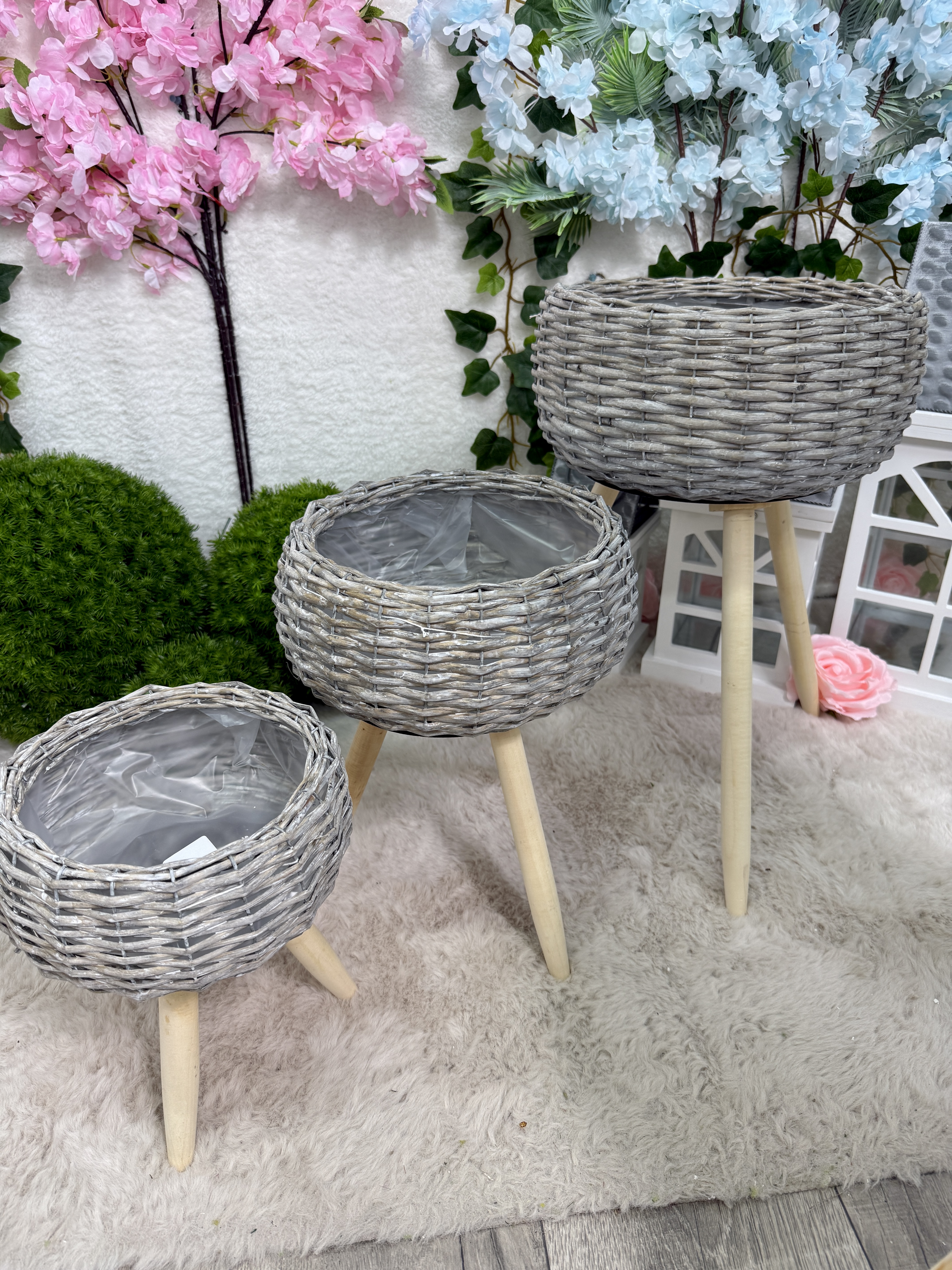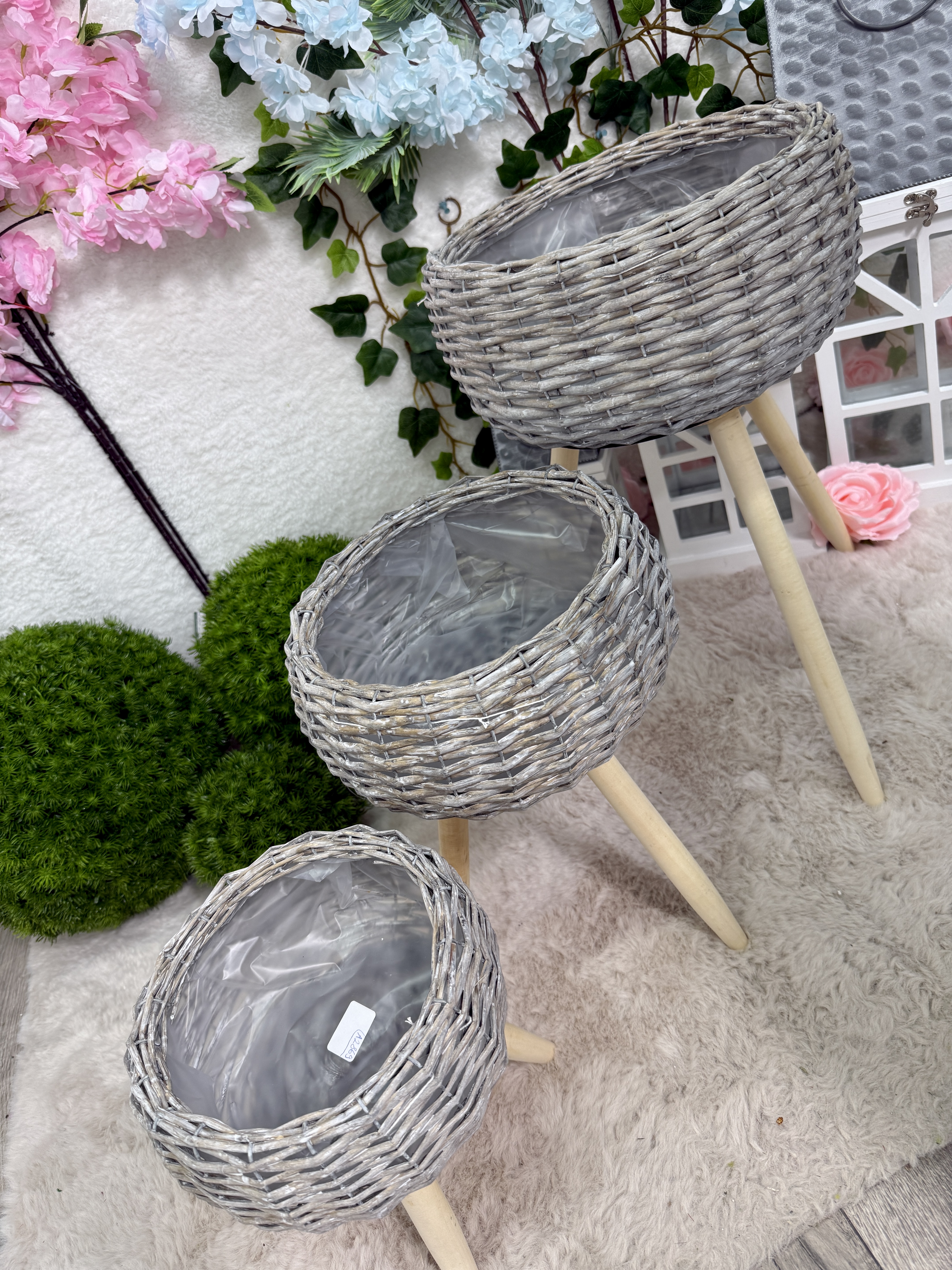 - Materiał: plecionka (wiklina / tworzywo) + drewniane nogi