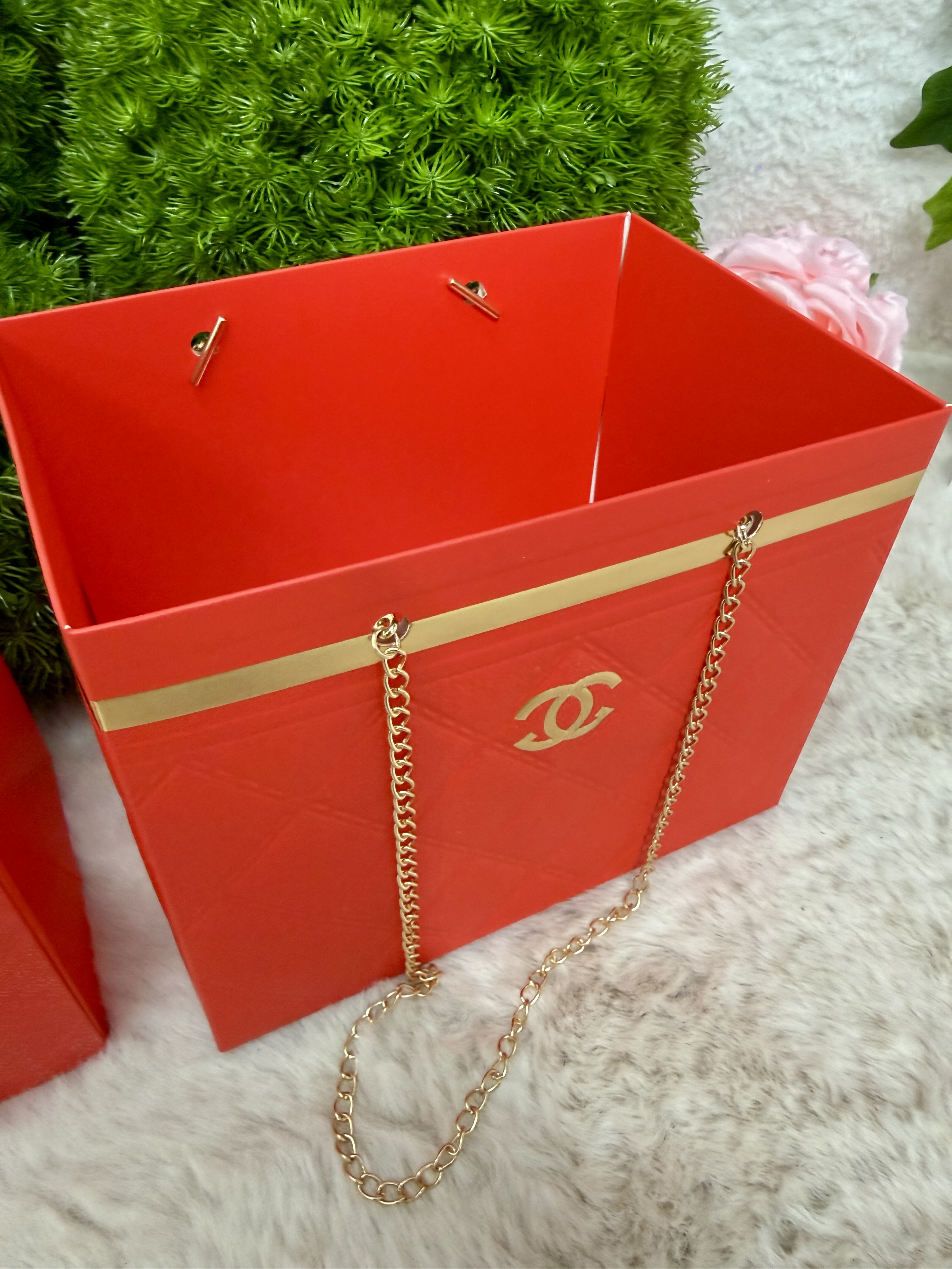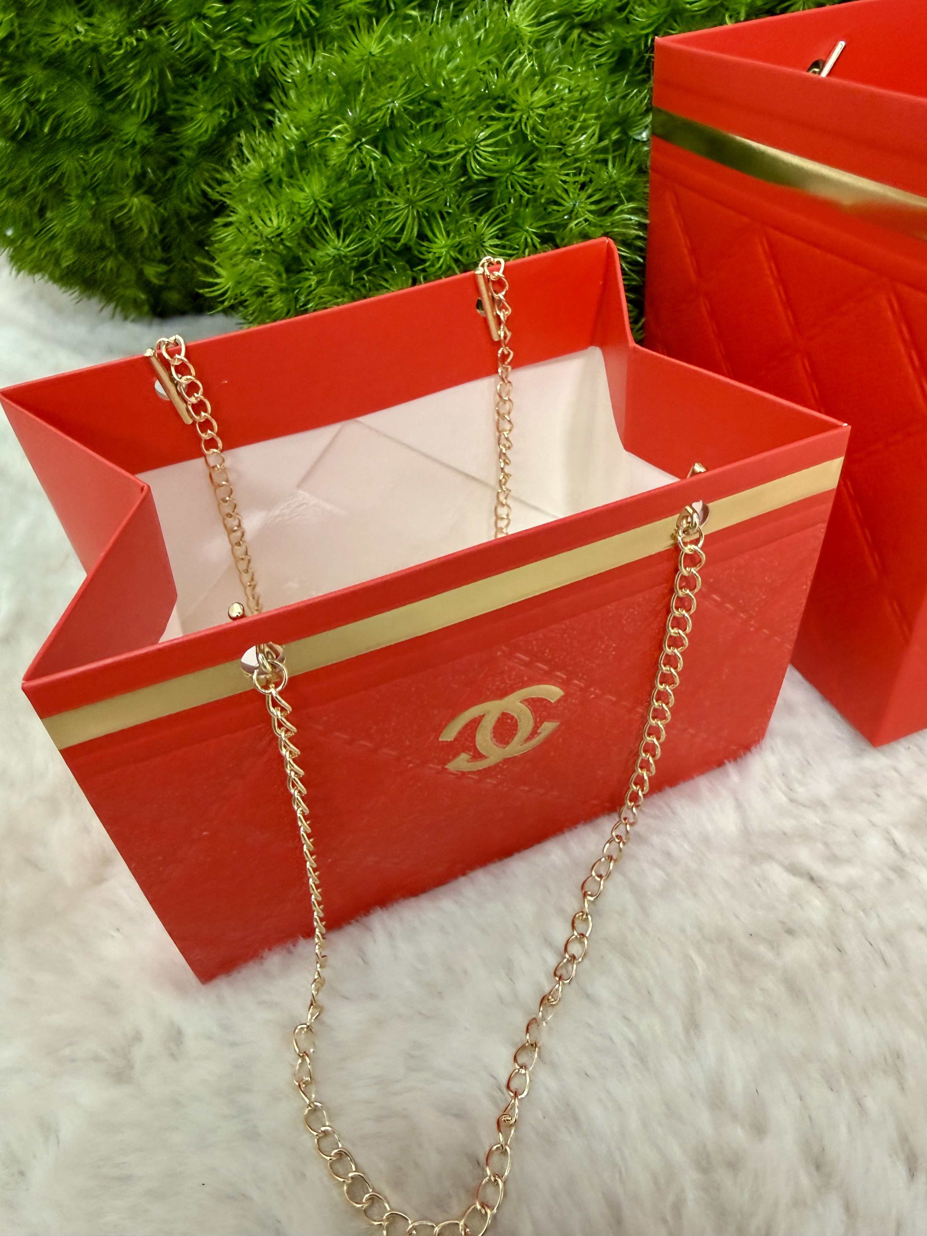 Każde pudełko wyposażone jest w dekoracyjne uchwyty w formie złotych łańcuszków, które nadają im wygląd eleganckich torebek i jednocześnie ułatwiają przenoszenie.