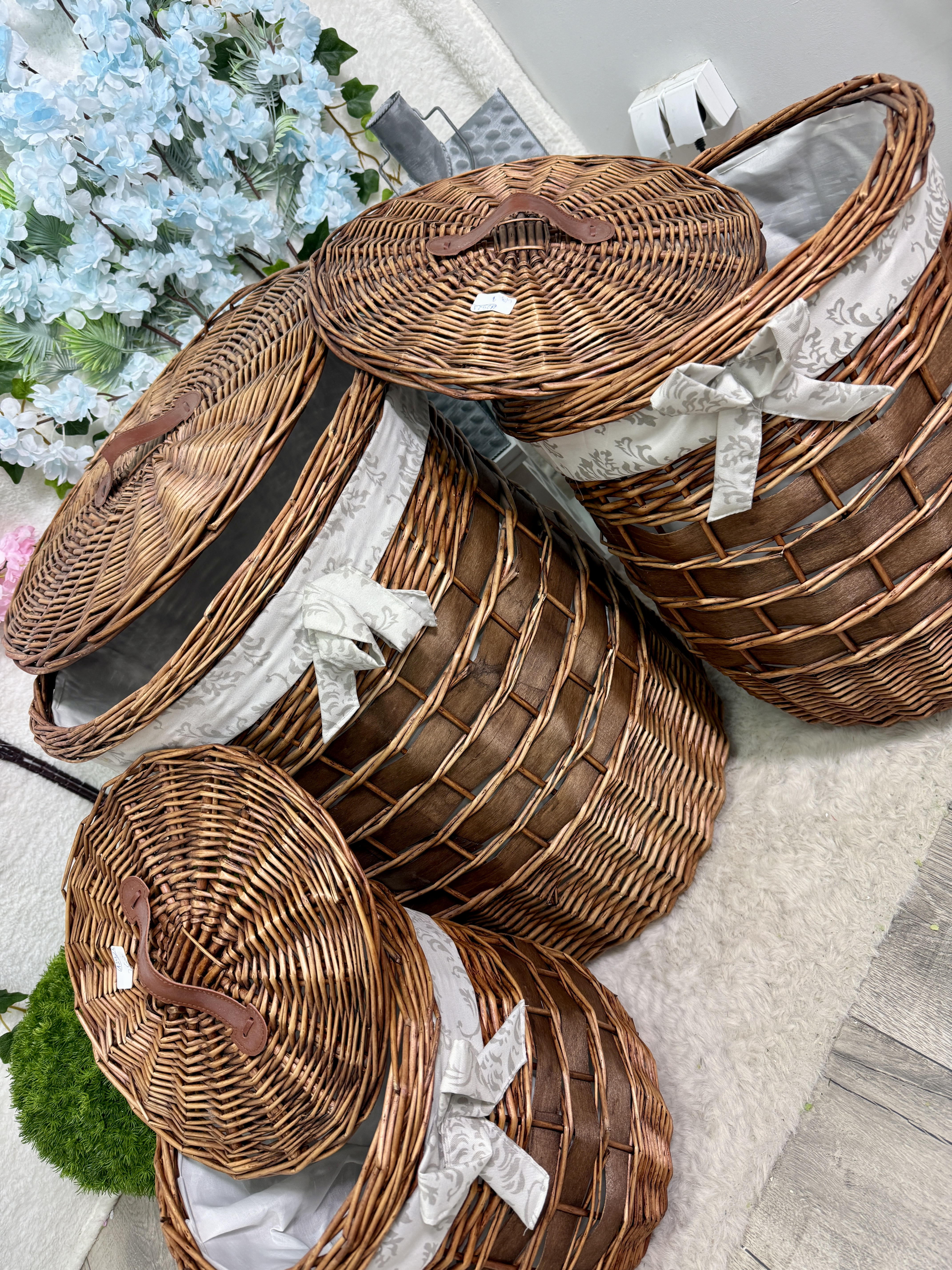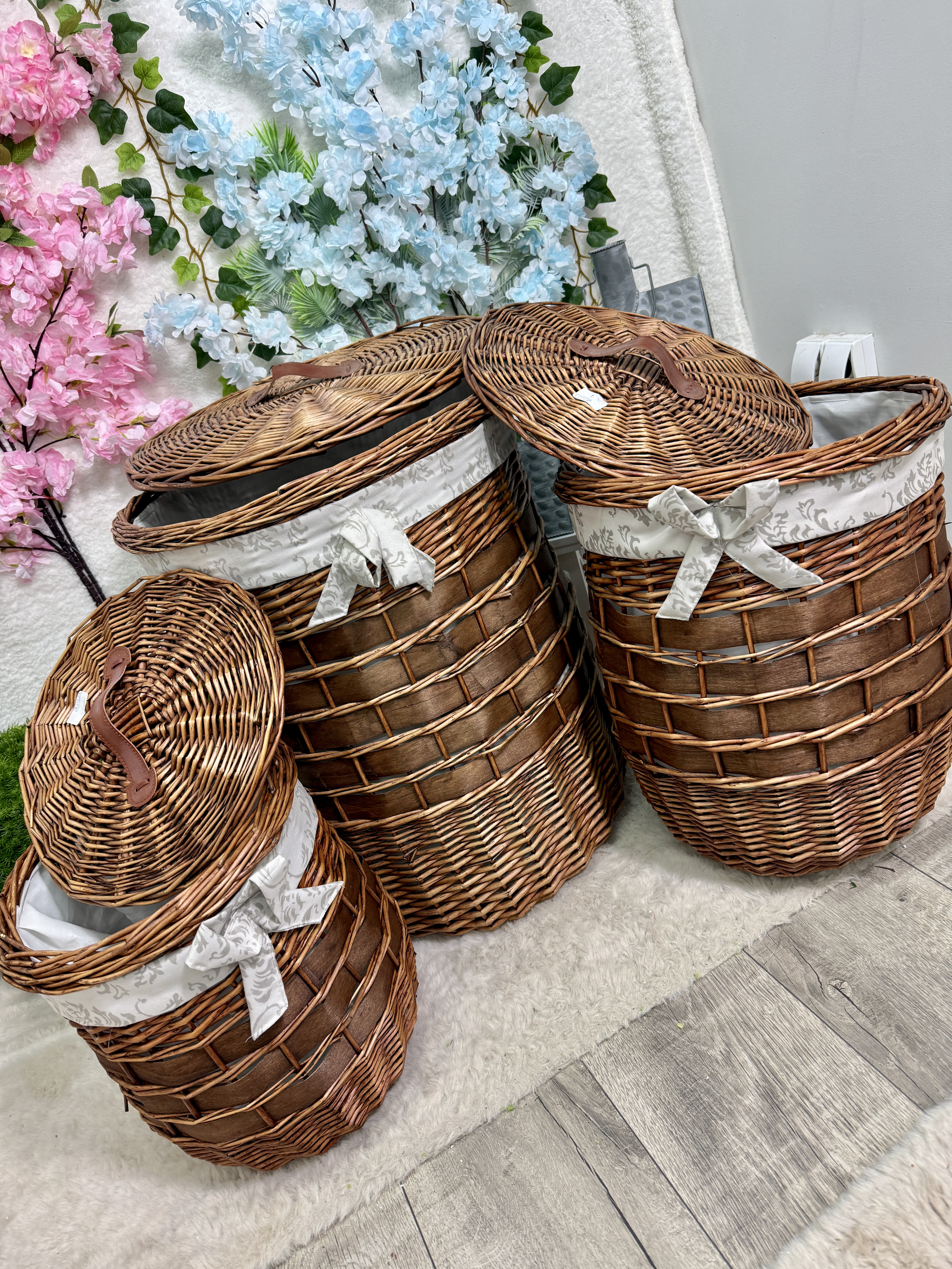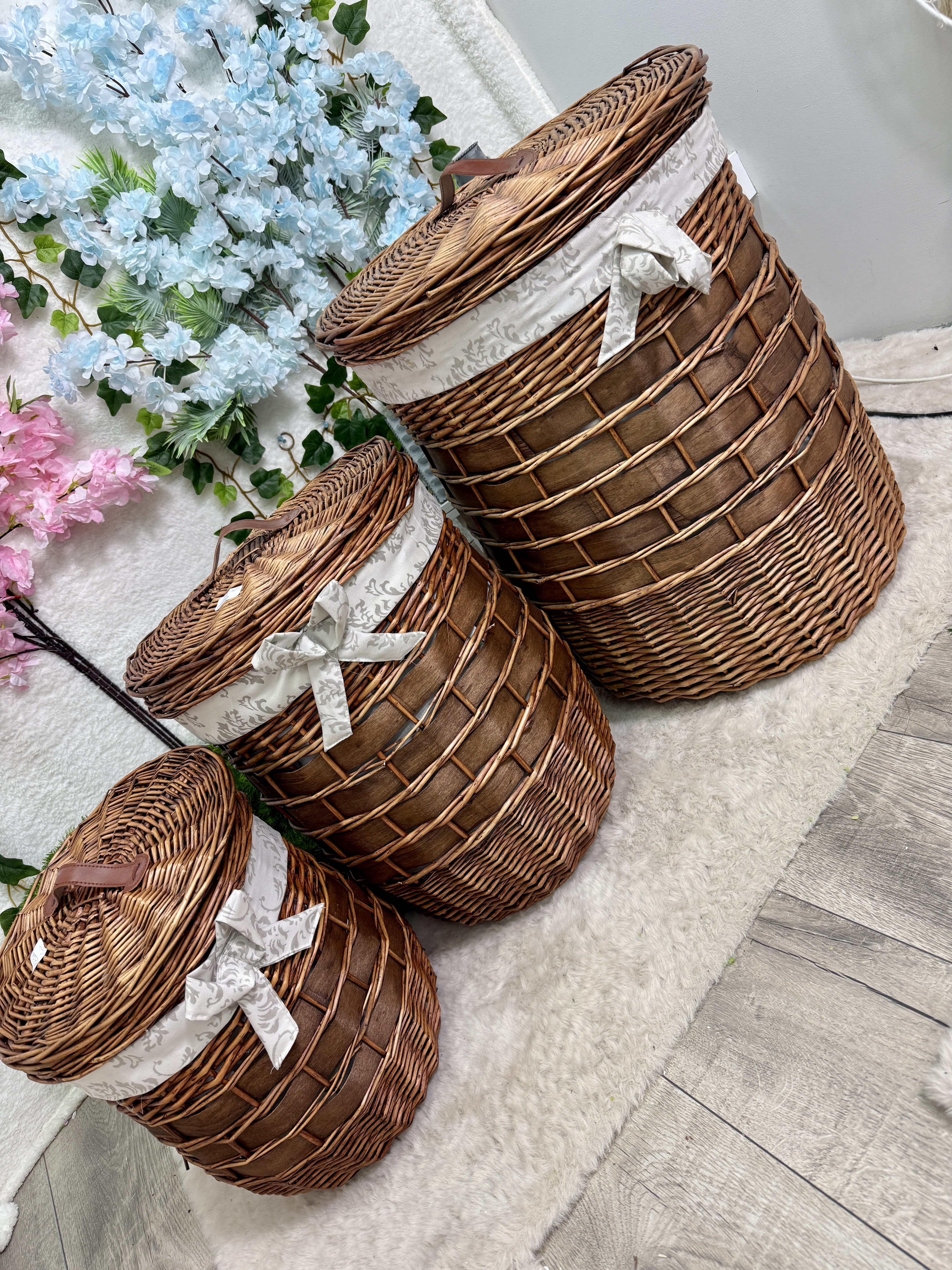Komplet koszy w różnych rozmiarach (mały, średni i duży), które świetnie sprawdzą się zarówno jako element dekoracyjny, jak i praktyczny organizer do domu. Kosze mają solidną, ręcznie plecioną konstrukcję z naturalnej wikliny w ciepłym, brązowym odcieniu, co nadaje im rustykalny i przytulny charakter.